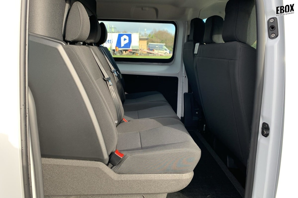 banquette fixe 3 places en rang 2 avec appui-tête réglables et 2 accoudoirs, position unique conforme aux réglementations fiscales pays, avec coffre de rangement amovible sous assises gauche et centrale (accessible depuis habitacle) et avec zone pour charge longue sous assise droite (accessible par la zone de chargement)