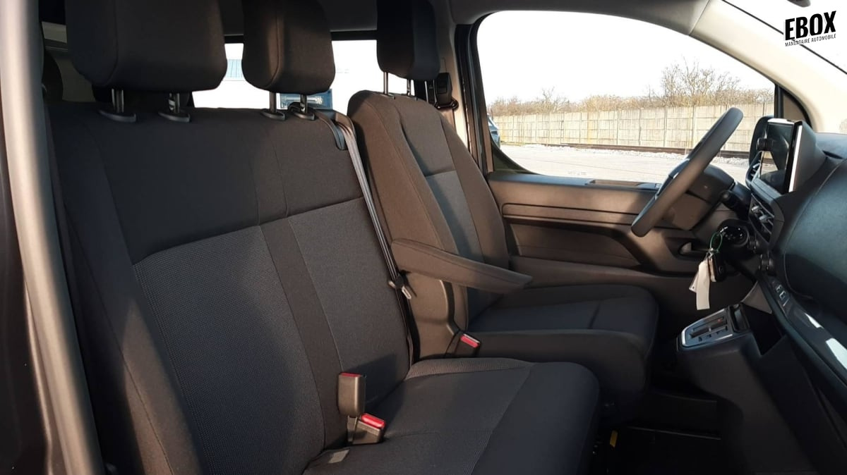 banquette fixe 3 places en rang 2 avec appui-tête réglables et 2 accoudoirs, position unique conforme aux réglementations fiscales pays, avec coffre de rangement amovible sous assises gauche et centrale (accessible depuis habitacle) et avec zone pour charge longue sous assise droite (accessible par la zone de chargement)
