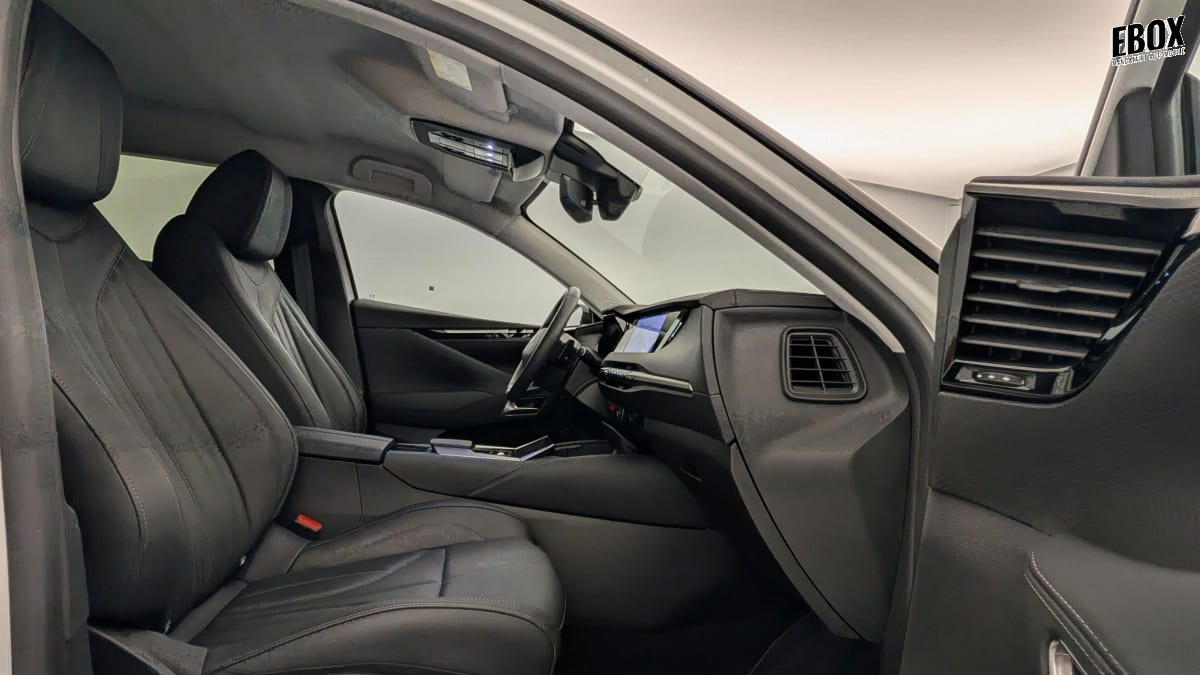 intérieur cuir grainé noir basalte et toile ds : ciel de pavillon clair décors de panneaux de porte chrome guilloché volant en cuir fleur mistral console centrale en toile ds mistral planche de bord en toile ds noir basalte façon écaille panneaux de portes en toile ds noir basalte façon écaille sellerie en cuir grainé noir basalte et toile ds