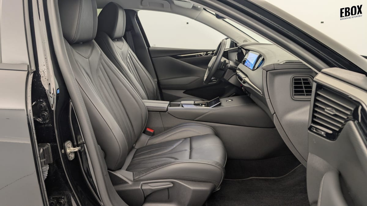 intérieur cuir grainé noir basalte et toile ds : ciel de pavillon clair décors de panneaux de porte chrome guilloché volant en cuir fleur mistral console centrale en toile ds mistral planche de bord en toile ds noir basalte façon écaille panneaux de portes en toile ds noir basalte façon écaille sellerie en cuir grainé noir basalte et toile ds