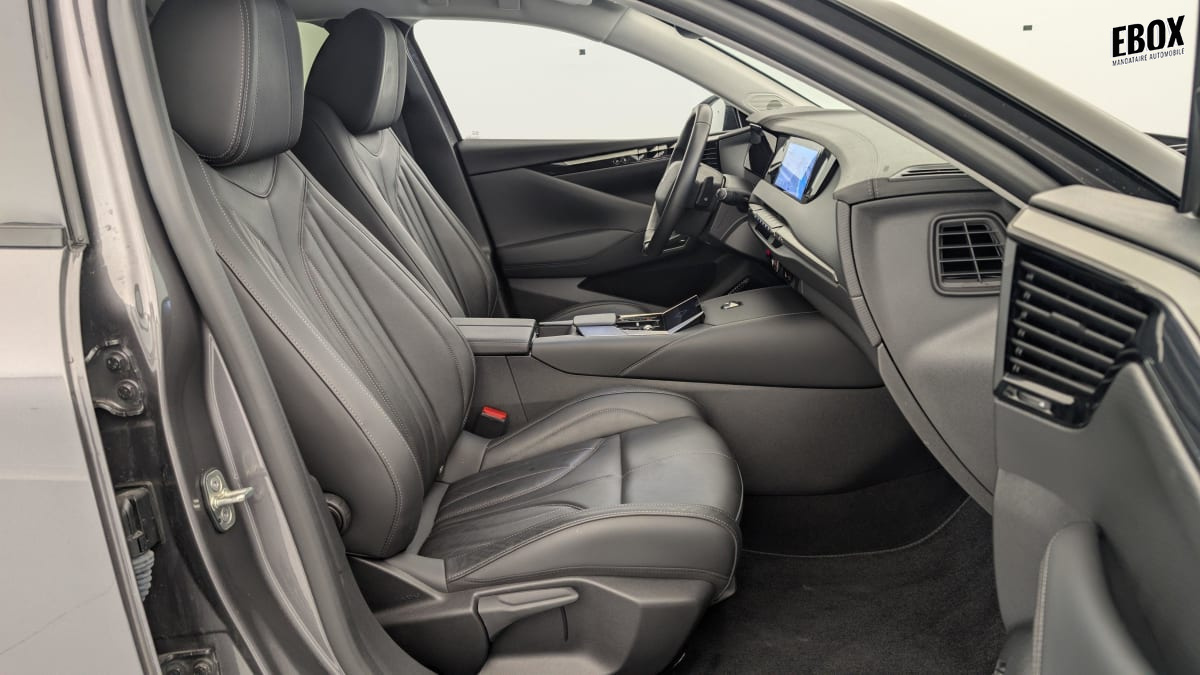 intérieur cuir grainé noir basalte et toile ds : ciel de pavillon clair décors de panneaux de porte chrome guilloché volant en cuir fleur mistral console centrale en toile ds mistral planche de bord en toile ds noir basalte façon écaille panneaux de portes en toile ds noir basalte façon écaille sellerie en cuir grainé noir basalte et toile ds