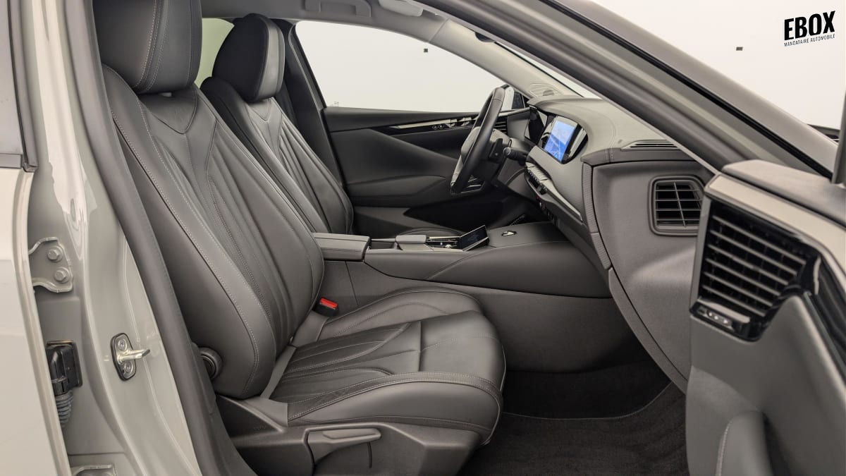 intérieur cuir grainé noir basalte et toile ds : ciel de pavillon clair décors de panneaux de porte chrome guilloché volant en cuir fleur mistral console centrale en toile ds mistral planche de bord en toile ds noir basalte façon écaille panneaux de portes en toile ds noir basalte façon écaille sellerie en cuir grainé noir basalte et toile ds parties centrales des sièges av, partie centrale des sièges latéraux ar et partie av des appuie-tête en cuir. bourrelets latéraux des sièges av, accoudoir central et siège central ar, et parties latérales et ar des appuis tête en toile ds.