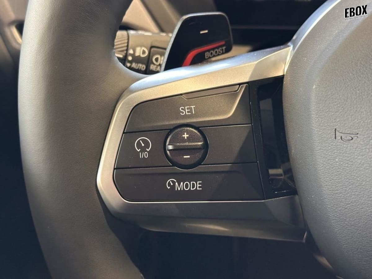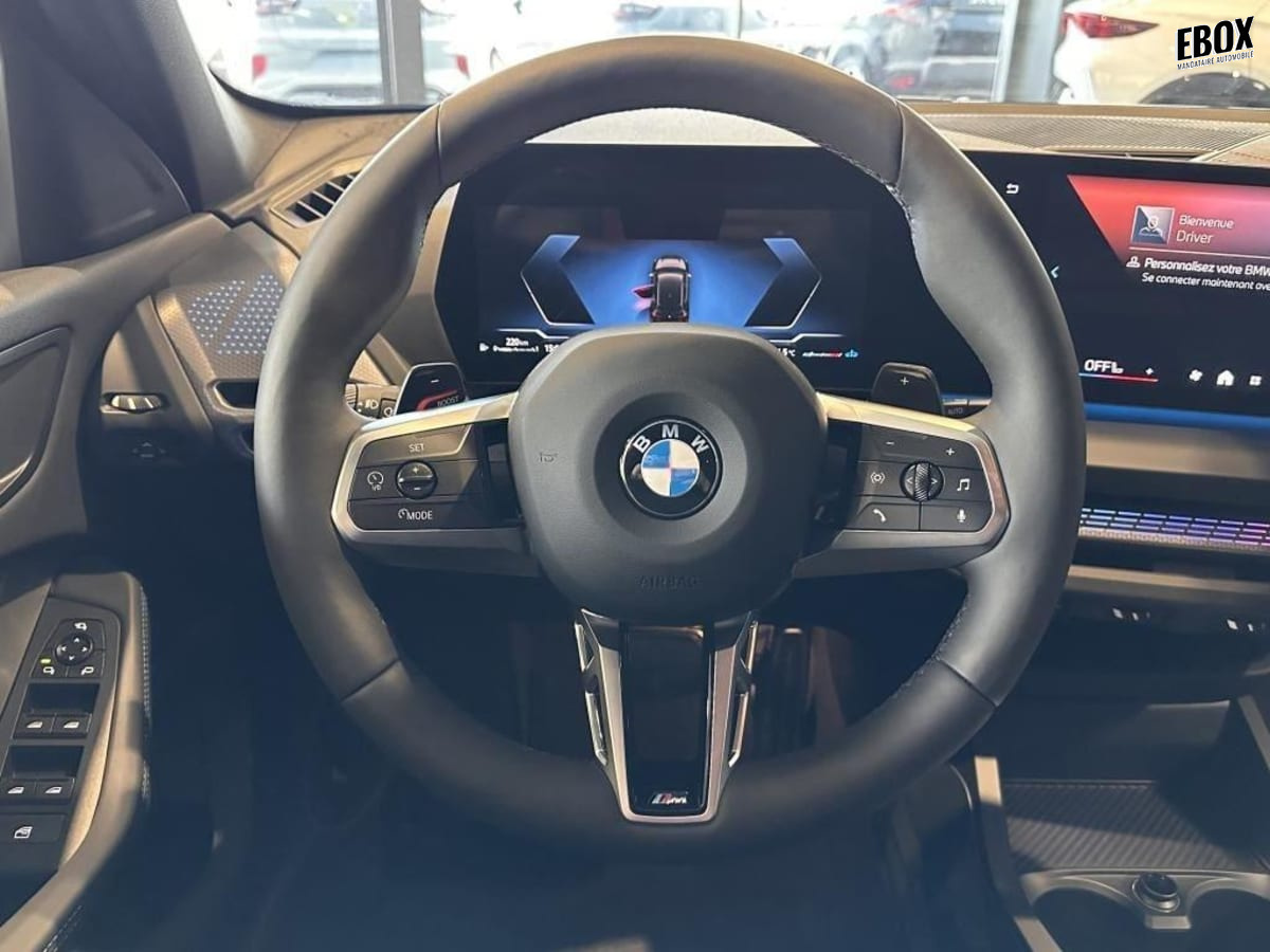 volant m gainé cuir (avec surpiqûres noires) trois branches. jante en cuir noir 'walknappa', inserts chrome perlé et repose-pouce dans le volant. logo m sur la base du volant