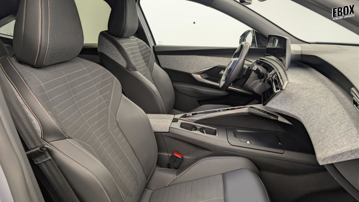 eléments de style intérieure planche de bord moussée avec décor tissu rimini chiné et alcôve graphène, façade et aérateurs noir laqué avec décor gris stène, panneaux de portes avec décor tissu rimini chiné, alcôve graphène et jonc gris stène, accoudoirs tep isabella, surpiqûres quartz à l'av, console centrale avec décor tissu rimini chiné, façade noir laqué et jonc gris stène, accoudoir tissu rimini chiné