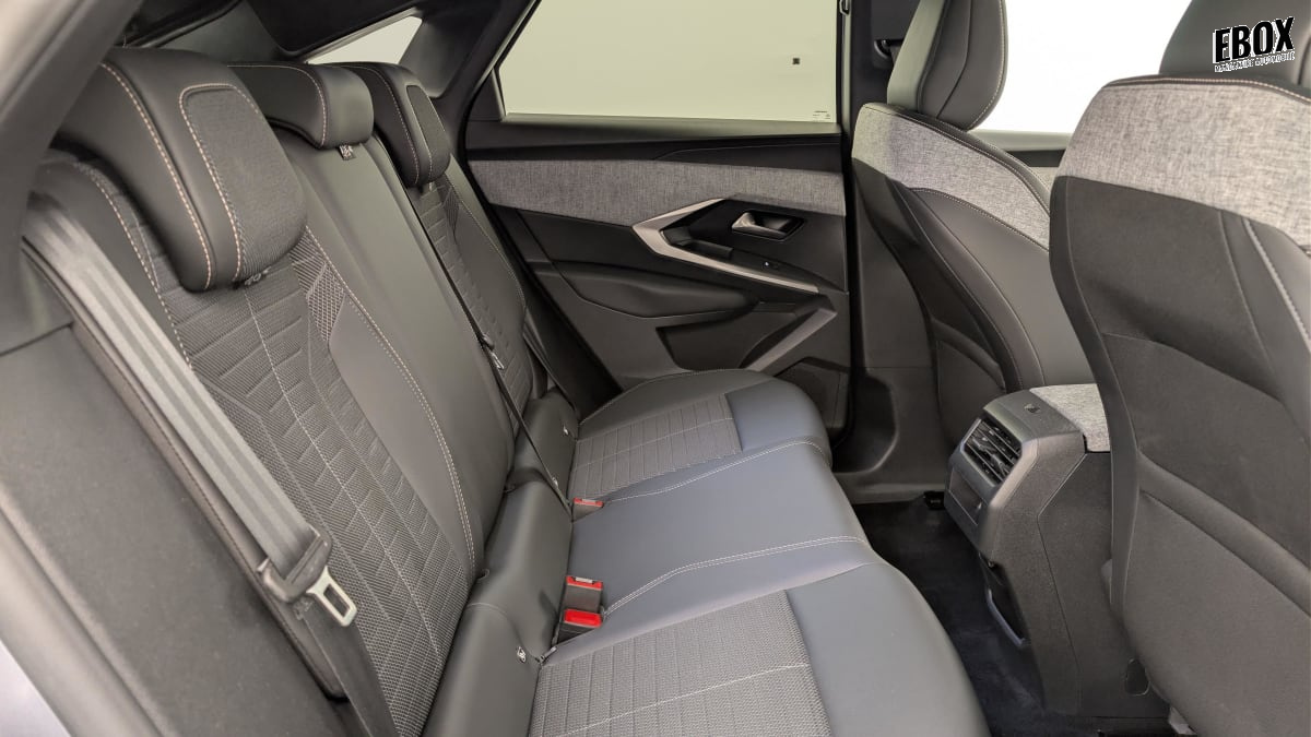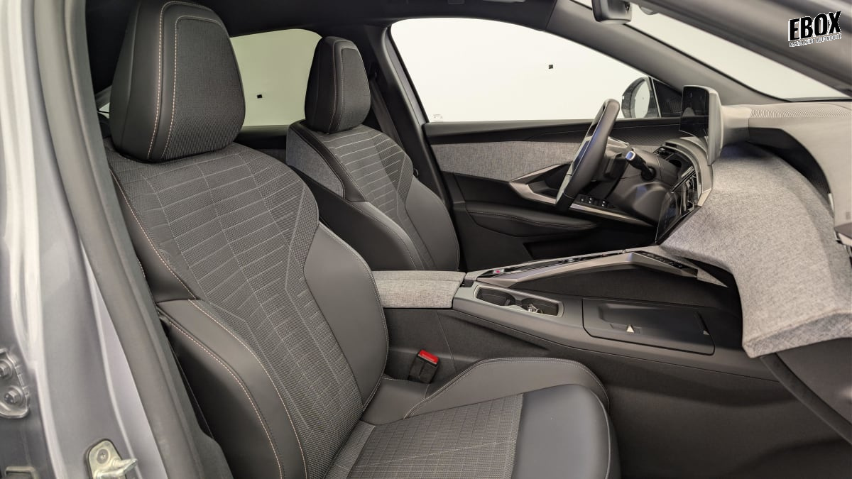 eléments de style intérieure planche de bord moussée avec décor tissu rimini chiné et alcôve graphène, façade et aérateurs noir laqué avec décor gris stène, panneaux de portes avec décor tissu rimini chiné, alcôve graphène et jonc gris stène, accoudoirs tep isabella, surpiqûres quartz à l'av, console centrale avec décor tissu rimini chiné, façade noir laqué et jonc gris stène, accoudoir tissu rimini chiné