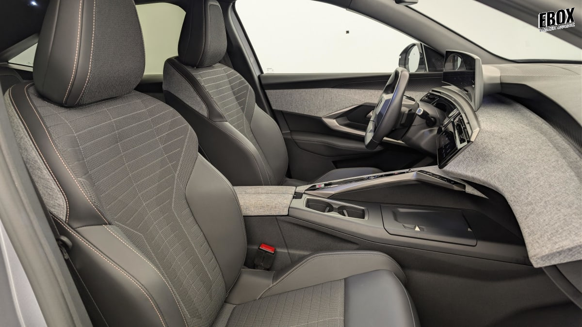 eléments de style intérieure planche de bord moussée avec décor tissu rimini chiné et alcôve graphène, façade et aérateurs noir laqué avec décor gris stène, panneaux de portes avec décor tissu rimini chiné, alcôve graphène et jonc gris stène, accoudoirs tep isabella, surpiqûres quartz à l'av, console centrale avec décor tissu rimini chiné, façade noir laqué et jonc gris stène, accoudoir tissu rimini chiné