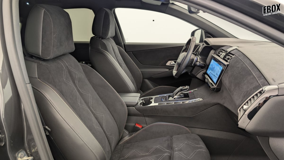 intérieur alcantara noir profond : sellerie alcantara noir profond avec toile ds console centrale en alcantara noir profond panneaux de portes en alcantara noir profond et surpiqûres carmin et or planche de bord alcantara noir profond et surpiqûres carmin et or volant cuir fleur perforé et coutures carmin et or ciel de pavillon sombre