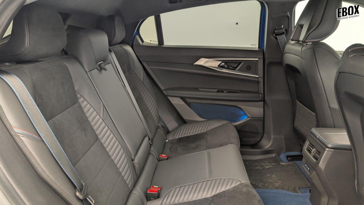 Sellerie mixte Alcantara avec surpiqûres bleues et logo Alpine lumineux