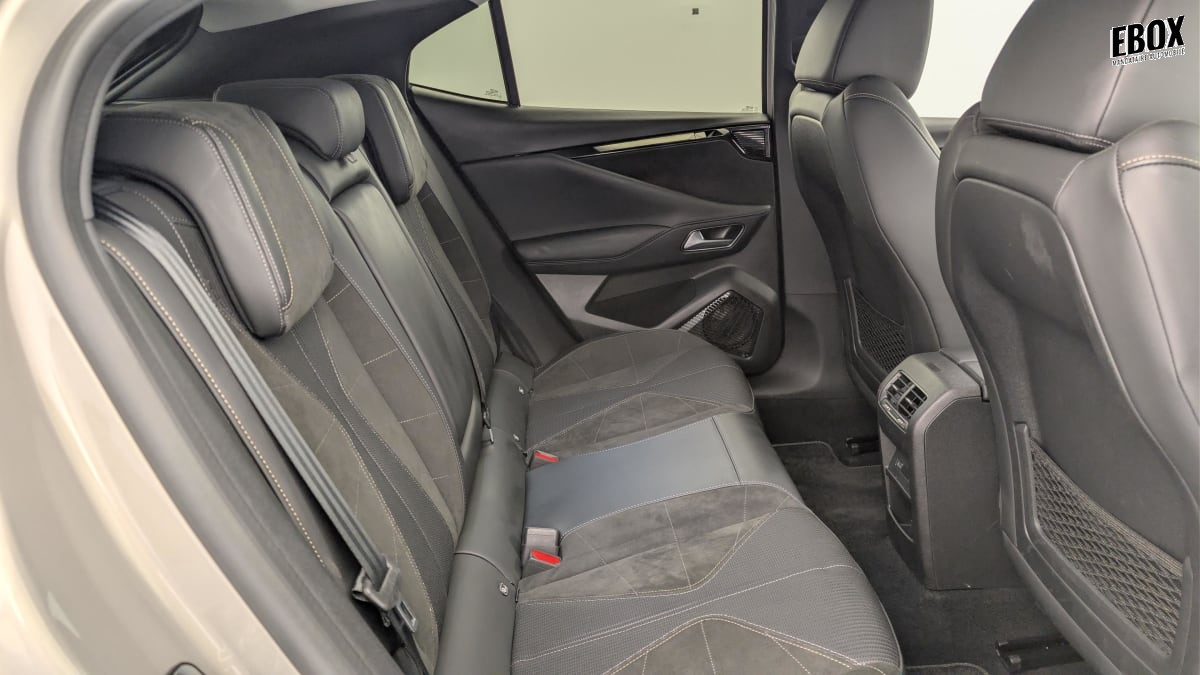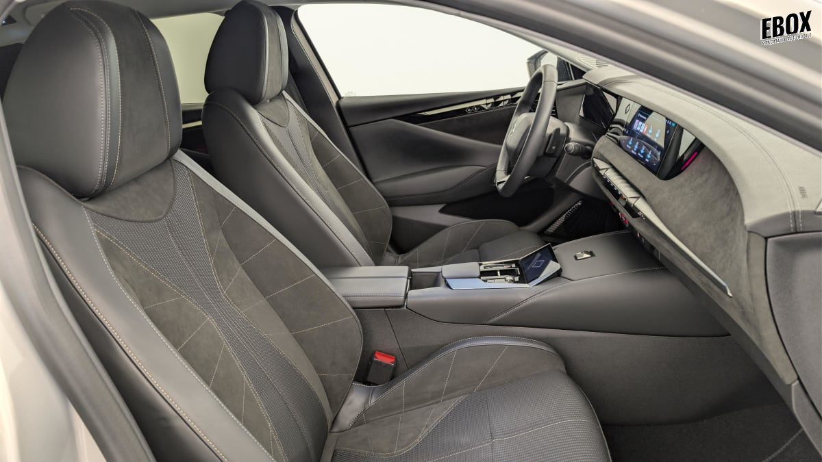 intérieur alcantara noir : planche de bord en alcantara ciel de pavillon clair sellerie en tissu tressé basalte avec alcantara et toile ds décors de panneaux de porte chrome guilloché volant cuir fleur mistral console en toile ds noir basalte panneaux de porte en alcantara et toile ds noir basalte