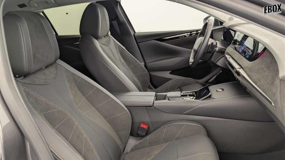 intérieur alcantara noir : planche de bord en alcantara ciel de pavillon clair sellerie en tissu tressé basalte avec alcantara et toile ds décors de panneaux de porte chrome guilloché volant cuir fleur mistral console en toile ds noir basalte panneaux de porte en alcantara et toile ds noir basalte