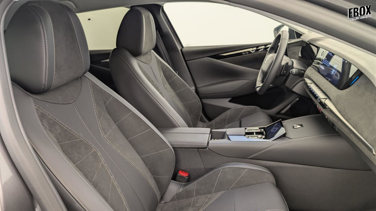 intérieur alcantara noir : planche de bord en alcantara ciel de pavillon clair sellerie en tissu tressé basalte avec alcantara et toile ds décors de panneaux de porte chrome guilloché volant cuir fleur mistral console en toile ds noir basalte panneaux de porte en alcantara et toile ds noir basalte