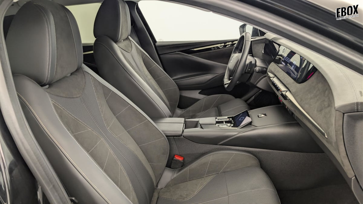 intérieur alcantara noir : planche de bord en alcantara ciel de pavillon clair décors de panneaux de porte chrome guilloché volant cuir fleur mistral console en toile ds noir basalte panneaux de porte en alcantara et toile ds noir basalte sellerie en tissu tressé basalte avec alcantara et toile ds