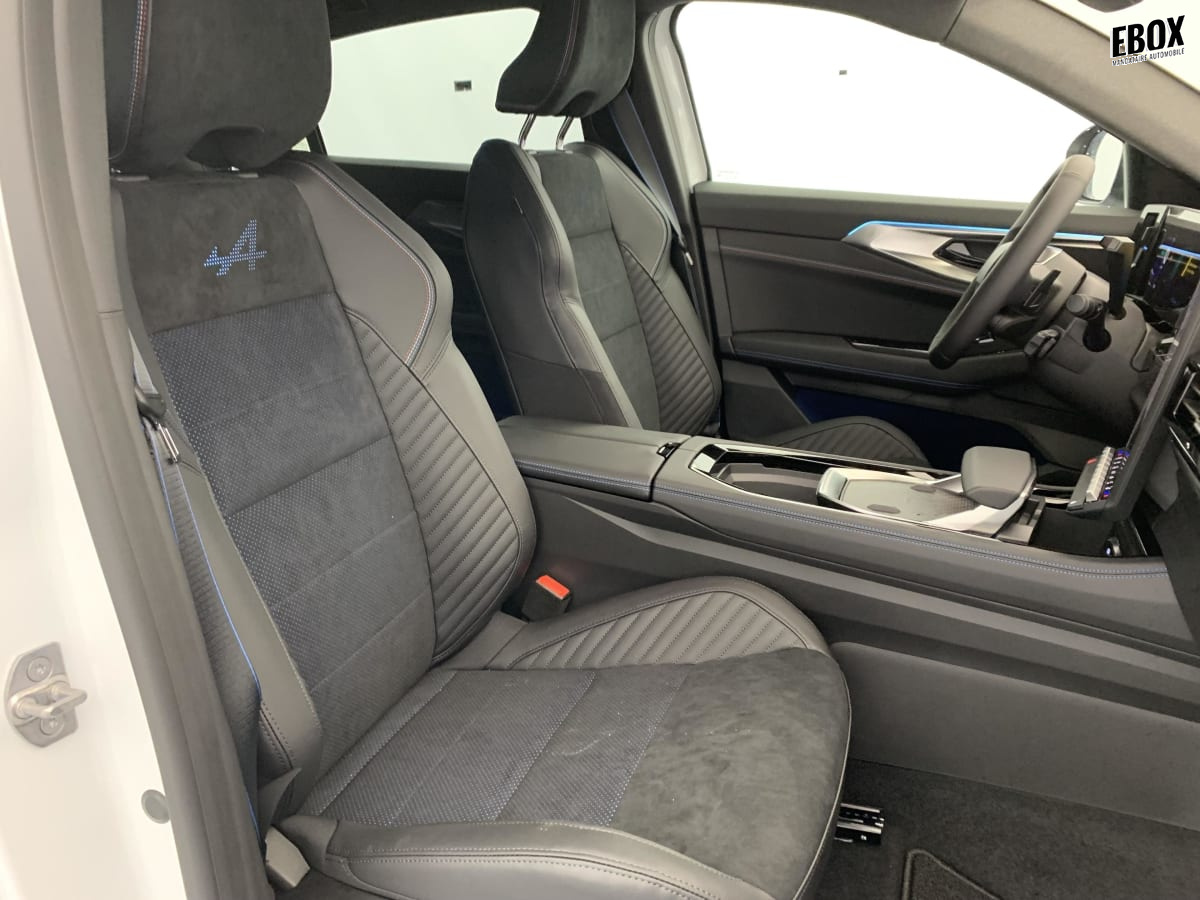 Sellerie mixte Alcantara avec surpiqûres bleues et logo Alpine lumineux