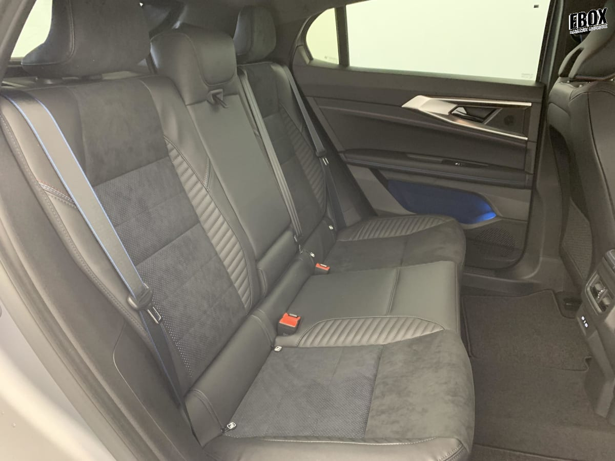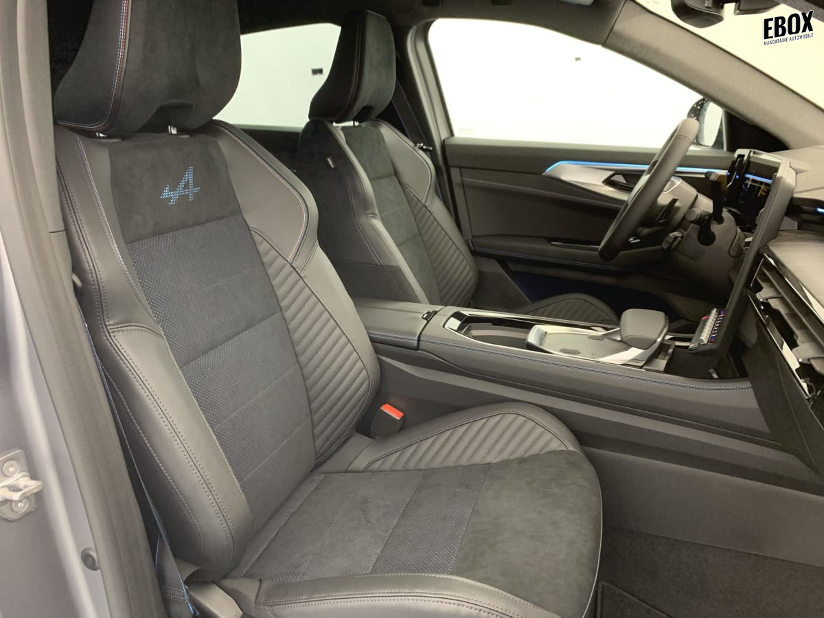 Sellerie mixte Alcantara avec surpiqûres bleues et logo Alpine lumineux