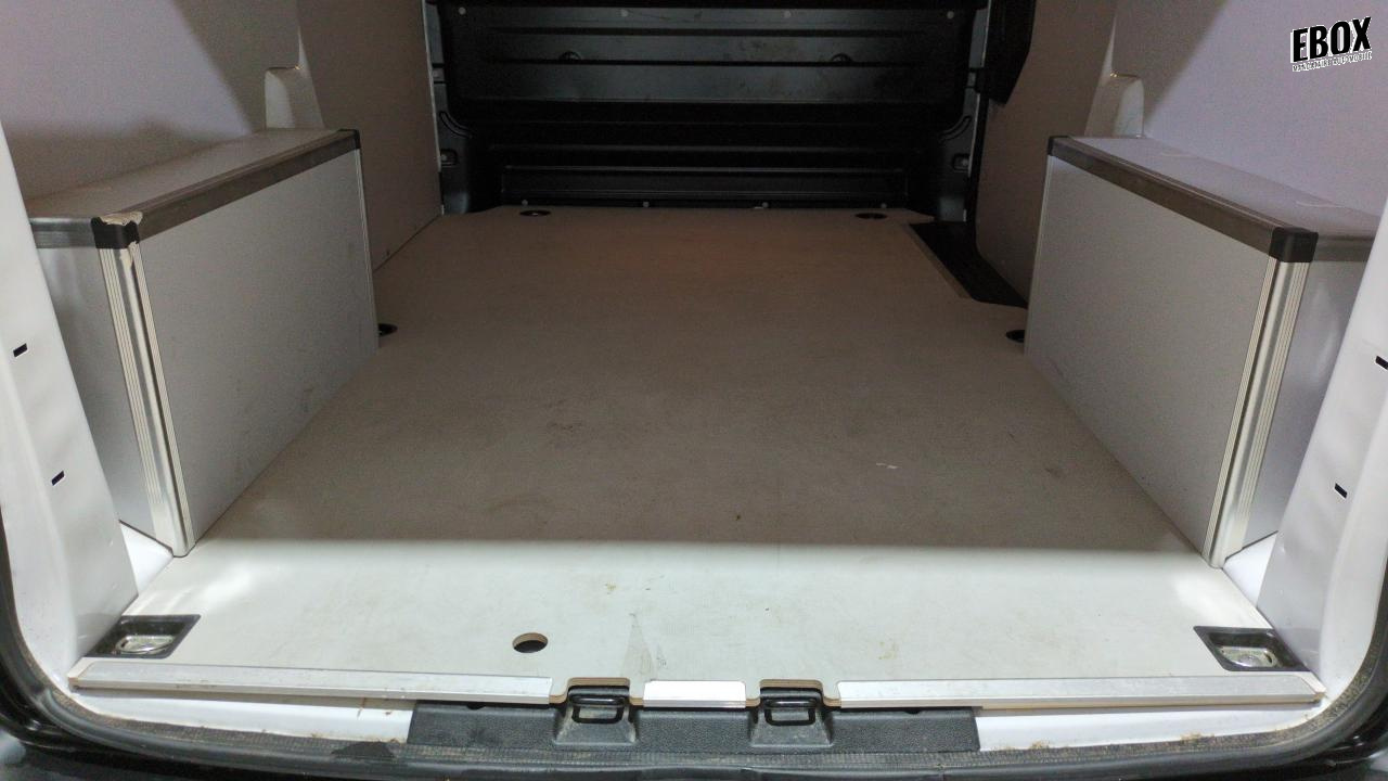 plancher bois anti-dérapant 9 mm avec baguette aluminium + habillages latéraux et coffrage des passages de roue en bois revêtu 6 mm
