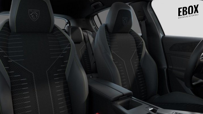 poignée de portes en similicuir avec doubles surpiqûres vert adamite / gris tramontane + planche de bord et panneaux de portes av avec éclairage d'ambiance + accoudoirs de portes en similicuir avec doubles surpiqûres vert adamite / gris tramontane + ciel de pavillon noir + pédalier sport et repose-pied en aluminium + seuils de porte av en alu avec lettrage